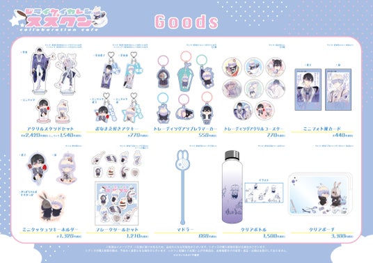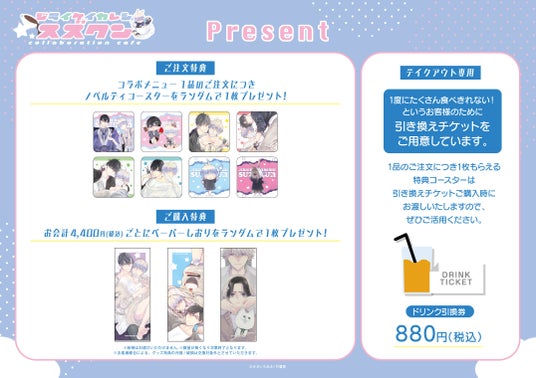 「地雷系彼氏すずくん」コラボメニュー1品のご注文につき、ノベルティコースター(全8種)をランダムで1枚プレゼント。関連グッズをご購入4,400円(税込)ごとにペーパーしおり(全3種)をランダムで1枚プレゼント。