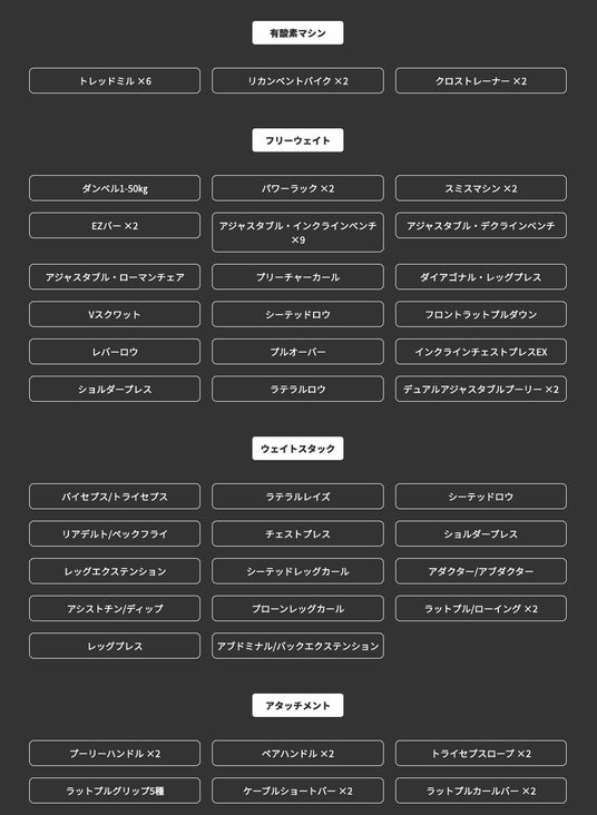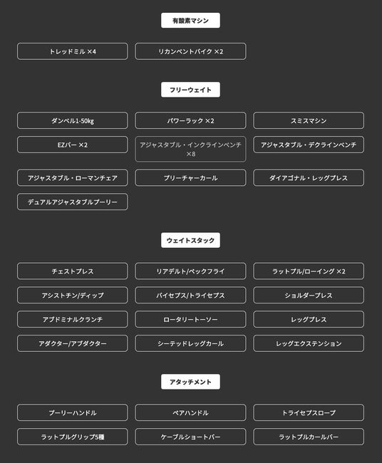 ダンベルやケーブルマシン、パワーラックなど基礎トレーニングに欠かせない設備も充実しています。