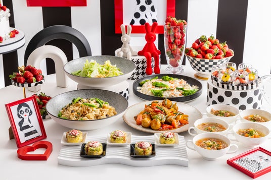 フェアごとに独自の世界観で話題を集めてきた「マーブルラウンジ」のスイーツビュッフェ。今年は“モノクロ・ガールズパーティー”をテーマに、ストライプやチェック、ポルカドットを取り入れたファッションエッセンスを散りばめた世界観で、ガールズパーティーの高揚感をお楽しみいただけます。ビュッフェ台には、女の子のお部屋をイメージした2Dとリアルが交差するフォトジェニックなデコレーションが登場。そこに苺をたっぷり使用したストロベリースイーツがまるでドレスやアクセサリーのように華やかに並び、空間を甘く彩ります。