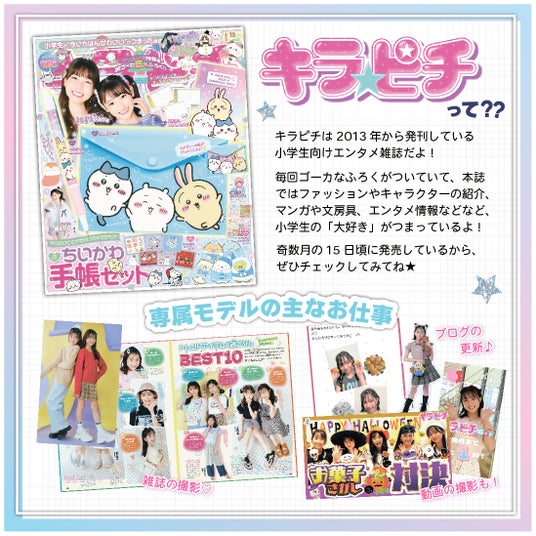 「キラピチ」は2013年から発刊している、小学生向けエンタメ雑誌。ファッションやコスメの情報が紹介されているほか、すみっコぐらしや、ちいかわなど人気キャラクターの文房具や雑貨、楽しい連載漫画などが掲載されていて、おしゃれに関心を持ち始めた女の子たちの「大好き」がつまっています。キラピチの公式YouTubeや公式SNSでは、オフショットの公開や、バラエティ動画企画の配信も行っています。
