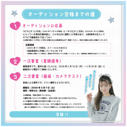 見事合格し、キラピチモデルとしてデビューした子は、『キラピチ6月号』(2026年5月15日発売号)の誌面にて発表されます。ご応募、お待ちしています!