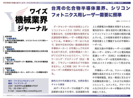【台湾情報】台湾の化合物半導体業界、シリコンフォトニクス用レーザー需要に照準<ワイズ機械業界ジャーナル2025年11月第4週号発行>