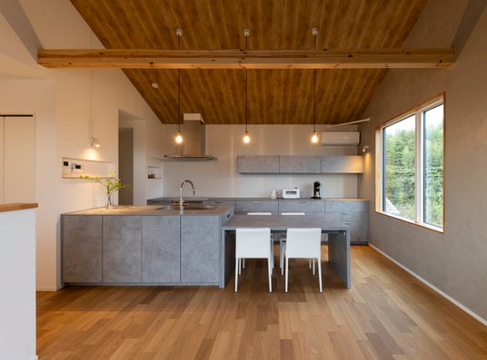 勾配天井が印象的なLDK。天井にはかなり本物に近い木目クロスを使用。さらに今回カスタマイズされたプランとしてダイニングキッチンはすべてグラフテクト製。木とグレーが調和し優しい印象の空間です。