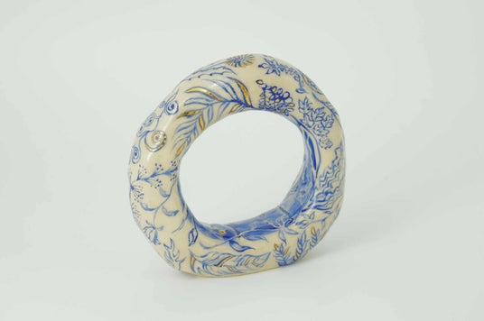 大胆なストロークで描かれる物語性豊かな絵画や、切り絵のモチーフを浮かせた立体的アプローチなど、平面と立体の境界を軽やかに行き来しながら独自の世界観を構築してきた久保田珠美。その表現は2018年、岐阜県多治見の名窯・幸兵衛窯との出会いで新たなステージへと進みます。