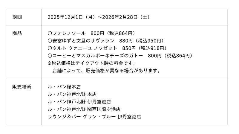 ホテル ラ・スイート神戸ハーバーランド(総支配人:檜山 和司 所在地:神戸市中央区)直営の「ル・パン神戸北野」は12月1日から、冬を愉しむ期間限定スイーツを販売します。