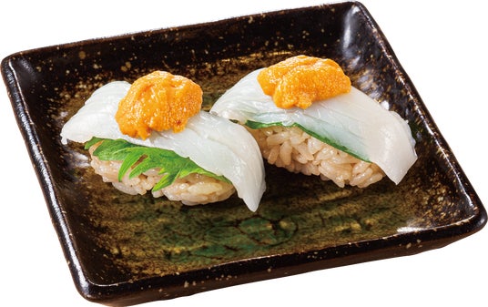 イカの上に店内仕込みの塩雲丹をのせた、贅沢な寿司。ネタとシャリの間に隠し味を忍ばせているため、醤油をつけずにそのままでお召し上がりいただけます。