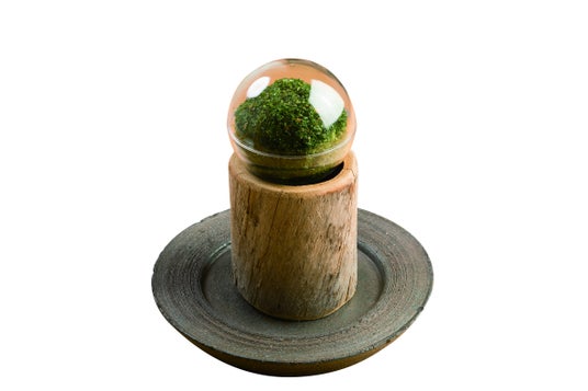 ニンニクとアンチョビをベースにしたオイルに、ベビー帆立と赤貝のひも、糸かつお、アオサなどを入れて、杉玉らしいアヒージョに仕上げました。
