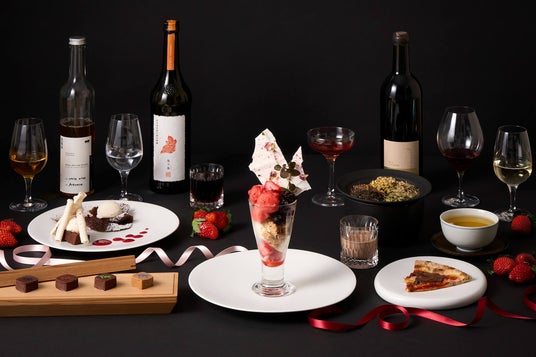 新政酒造の日本酒を合わせた特製「ホットチョコレート」※で始まるコースには、「ボンボンショコラ」や「苺の生ガトーショコラプレート」など、カカオの魅力をさまざまに表現したメニューが続きます。※ノンアルコールコースはチャイ風ホットチョコレートです
