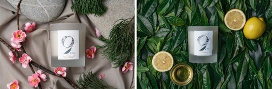 ▲9KOSフレグランス Candle 各200g(左)Ume & Cedarwood(7,920円)(右)Yame Green Tea (7,920円)