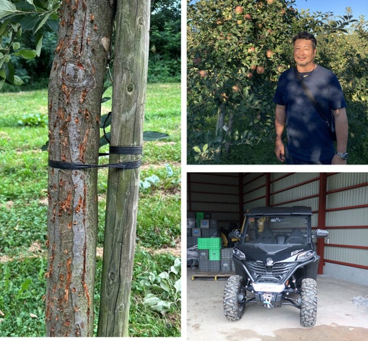 ▲クマが爪痕を残し、マーキングされたりんごの木(左) 生産者の斎藤さん(右上)、安全のため購入したバギー
