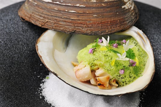 冬に旬を迎えるホッキ貝。菜の花の香りのエスプーマを添えました。