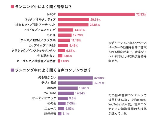 また、RUNNETユーザーへのアンケート調査では、ランニング中に音楽以外に楽しんでいる音声コンテンツは、ラジオ番組に次いでポッドキャスト、YouTubeが人気となりました。