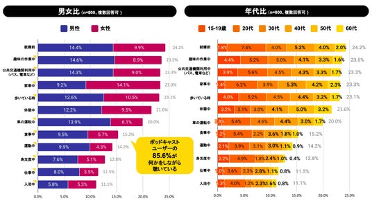 また、ポッドキャストユーザーの85.6%が「ながら聴き」を実践しています(表2)。「家事をしながら」(39.8%)や「移動中」(32.1%)がその代表例である一方、「歩いている時」(23.1%)と「運動中」(14.2%)も、「ながら聴き」の人気な聴取シーンの一つであることがわかります。