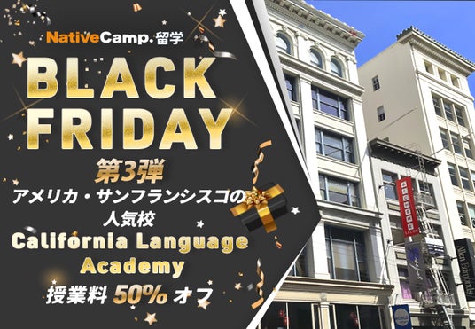 ネイティブスピーカーと回数無制限のオンライン英会話サービス「ネイティブキャンプ英会話」を展開する株式会社ネイティブキャンプ(東京都渋谷区 代表取締役: 谷川国洋)は、海外留学エージェントサービス「ネイティブキャンプ留学」において、年に一度のお得なブラックフライデーキャンペーン 第3弾 - アメリカ留学(California Language Academy)授業料50%オフを実施いたします。