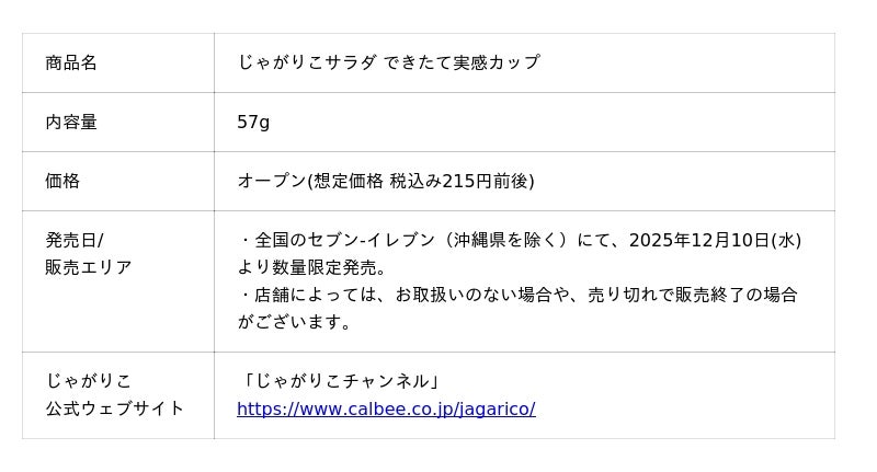 カルビー株式会社(本社:東京都千代田区、代表取締役社長兼CEO:江原 信)は、独自の製法で“はじめカリッとあとからサクサク”の心地よい食感が楽しめる「じゃがりこ」ブランドから、製造後10日以内に店頭にお届けする新しいコンセプト商品として『じゃがりこサラダ できたて実感カップ』を2025年12月10日(水)から全国のセブン‐イレブン(沖縄県を除く)で数量限定発売します。※なくなり次第終了。一部店舗では取扱いがない場合がございます。