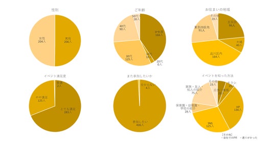 来場者の傾向としては品川区内を中心に0-9歳の子育て世代が中心で満足度が非常に高く、410名のうち、99%の方に【とても満足~やや満足】、【また参加したい】と回答を得ました。