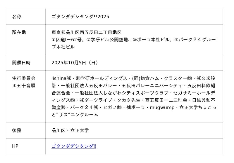 当社を含む産官学の計21団体の連携・共創による、五反田のまちを舞台としたイベント「ゴタンダデシタンダ!!2025」を10月5日(日)に開催いたしました。