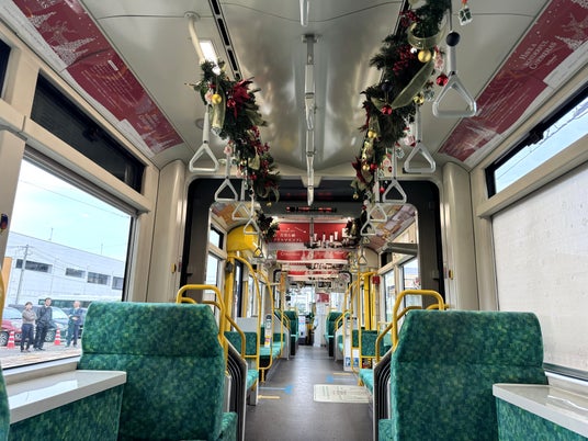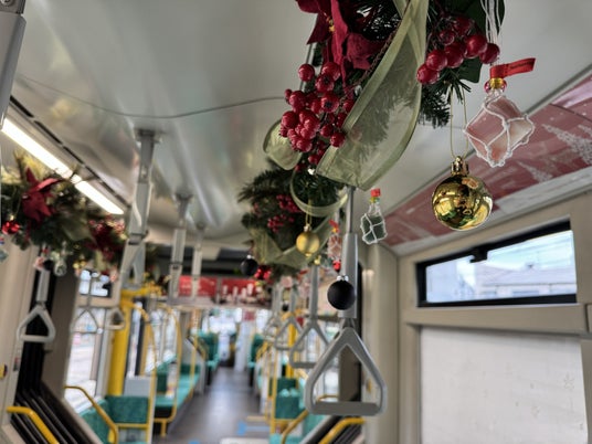 路面電車1編成をジャック。車両内にポインセチアやモミの木、オーナメントなどのクリスマス装飾とともに、首里石鹸のオリジナル製品「ボタニカルハンドメイド洗顔石鹸CUBE」を約50個装飾。