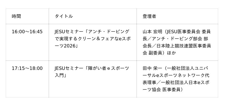 パネルや動画を通じて、eスポーツ関連団体の各種取組やeスポーツの活用事例等をご紹介します。また、日本代表ユニフォームの展示も予定しています。【日時】1月9日(金)~11日(日)の3日間