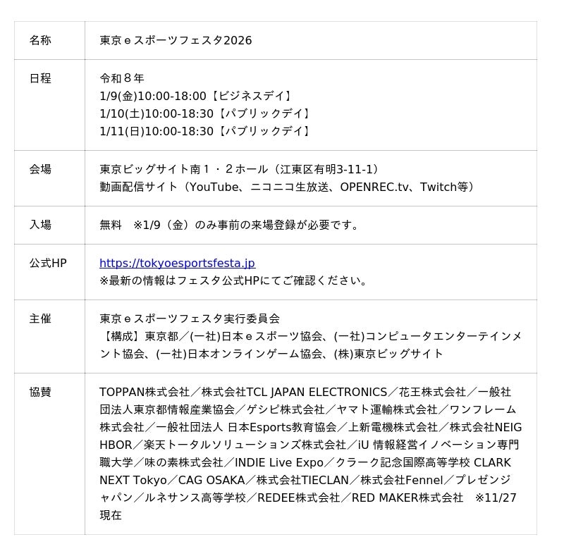 東京都及び東京eスポーツフェスタ実行委員会は、eスポーツの普及と関連産業の振興を目的として、令和8年1月9日から11日までの3日間、東京ビッグサイトにて「東京eスポーツフェスタ2026」(以下「フェスタ」という。)を、開催します。