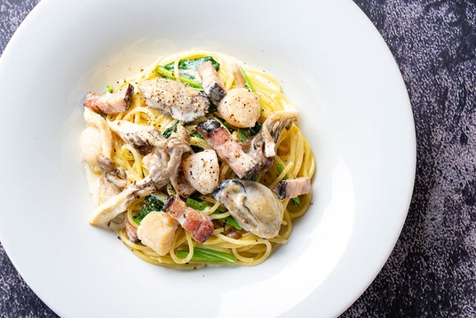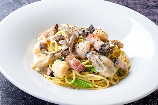 贅沢なほど濃厚でクリーミーな牡蠣と大粒のホタテがゴロゴロと入ったクリームソーススパゲティ。
