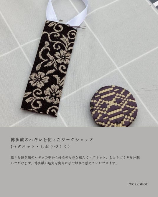 本イベントでは、博多織のハギレでつくる小物ワークショップ(マグネット・しおり) も開催。