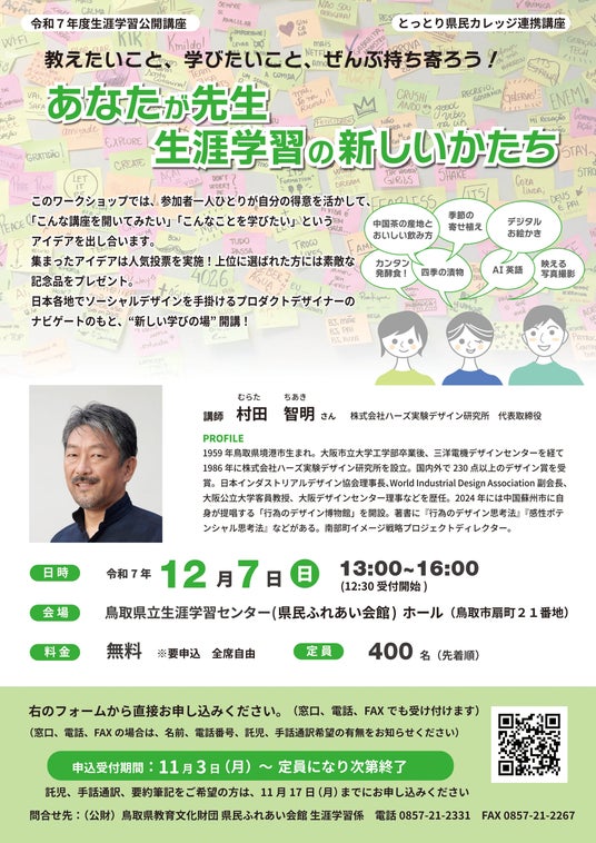 プロダクトデザイナー村田智明による、鳥取市の新しい生涯学習を考える「あなたが先生 生涯学習の新しいかたち」ワークショップとデザイン思考に関する講演を12月7日(日)に開催【無料】