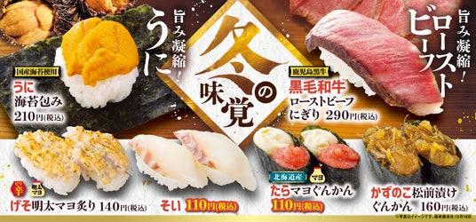 フェアの注目メニューは、濃厚な味わいのうにを使った「うに海苔包み」や、鹿児島黒牛を店内で仕込んだ「黒毛和牛ローストビーフにぎり」。ほかにも、不動の人気を誇る「げそ明太マヨ炙り」、冬に食べたくなる「かずのこ松前漬けぐんかん」、今が旬の「そい」や北海道産たらを使った「たらマヨぐんかん」など、上質かつ多彩なネタをお値打ち価格で取り揃えました。