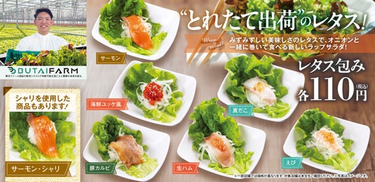 また、同日より新たに「レタス包み」メニューも登場。お寿司と一緒にさっぱり食べられるよう、シャリまたはオニオンベースを選べるスタイルで提供します。サーモン、真だこ、えび、生ハム、豚カルビ、海鮮ユッケ風の6種をラインアップし、健康志向の方にも気軽にお寿司を楽しんでいただける内容となっています。