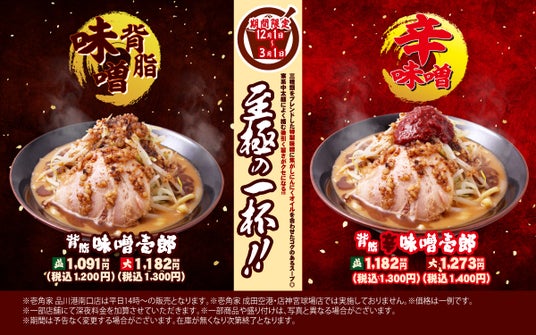 株式会社ガーデン(本社:東京都新宿区 代表取締役社長:川島賢 以下「当社」)が運営する「壱角家」は、2025年12月1日(月)から2026年3月1日(日)の期間限定で、『背脂味噌壱郎』と『背脂辛味噌壱郎』を全国の壱角家店舗※で販売いたします。