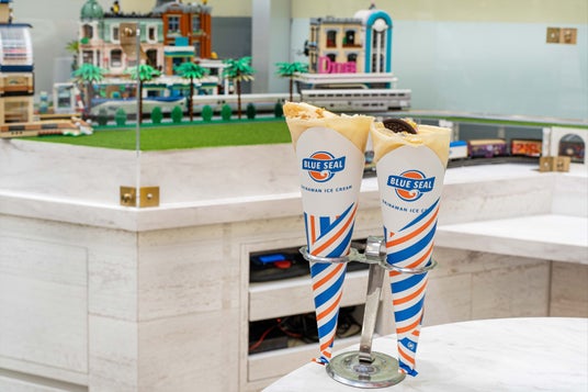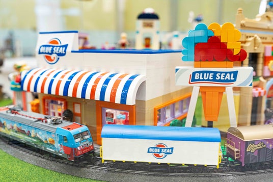ブロックでできたミニチュアの街はブルーシール発祥の地・沖縄をイメージしました。牧港本店の雰囲気もスタッフの手作業で再現し、細部にまでこだわった温かみある空間が広がります。