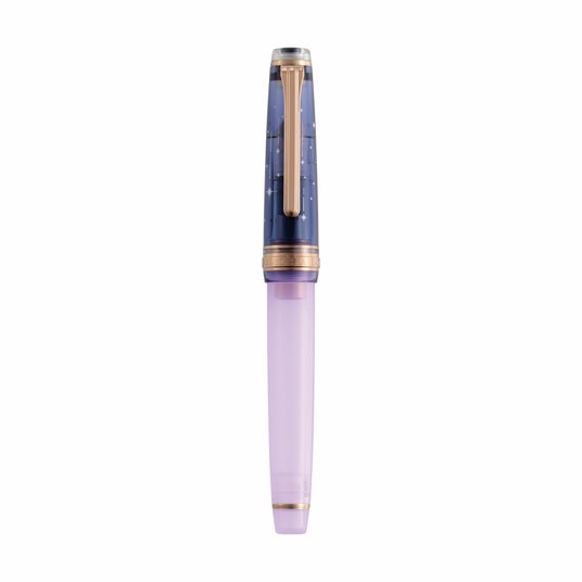 書き心地とオリジナリティ高い装飾性にこだわり、胴が細く軽量でプロユースにも使いやすいスリムタイプの万年筆。蓋部分には本製品限定の「星降る」デザインの蒔絵印刷が施され、幻想的な世界観を表現しています。