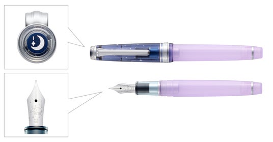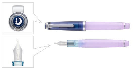 万年筆は、静かな夜のはじまりを感じさせるクリアネイビーの蓋と神秘的な淡いトーンのパープルのボディとを組み合わせました。蓋栓飾りは月と星、ペン先は夢にちなんだバクをあしらっています。