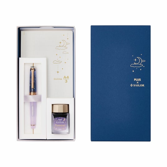 プラスとセーラー万年筆のコラボ企画 第9弾 “夢宵(ゆめよい)”をテーマにした万年筆・ノート・ボトルインクの3点セット「カ.クリエ プレミアムクロス×万年筆 夢宵限定セット」2種を発売
