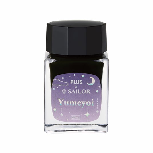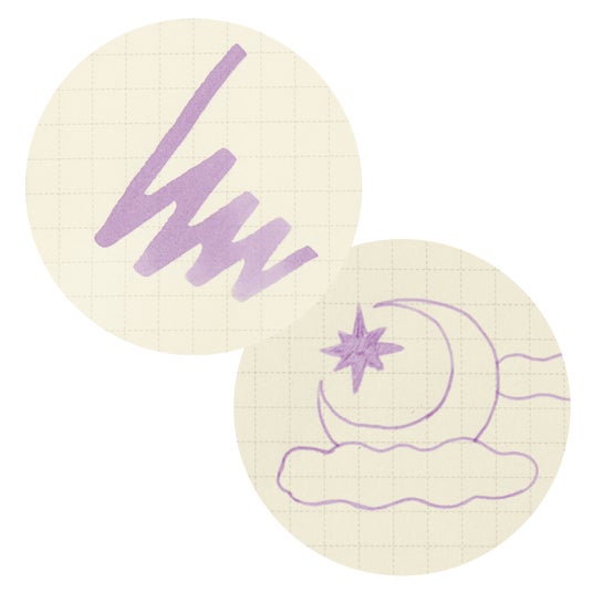 “夢宵”テーマにあわせ、新たに調色した淡いパープルカラーの限定「Yumeyoi」です。夢の中から出てきたような幻想的なカラーは、ノートのクリーム色の中紙にもきれいに発色し、色の濃淡が楽しめます。ラベルには月と星のシルバーレインボーの箔押しをあしらっています。使い切りやすく、かわいらしい20mlのミニボトル入りです。