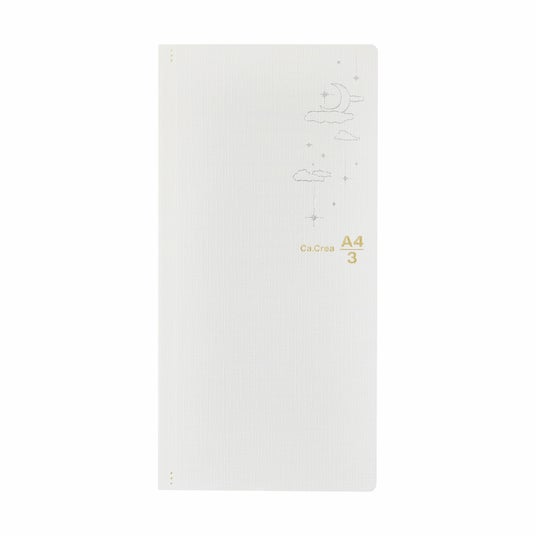 三つ折りにしたA4用紙がすっきり収まる、A4×1/3サイズのノートです。ホワイトの表紙は耐久性に優れた紙クロスを使用し、月と星の箔押しをあしらいました。中紙は目に優しいクリーム色で、万年筆のインクが裏抜け・裏移りしにくく、書き心地の良い上質紙を採用。糸かがり製本で、しっかり開きます。