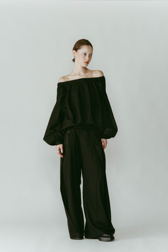 4WAY DESIGN BLOUSEのSTRIPE BLKとPIERCED DRAPE PANTSの柄BLKはセットアップで着用可能です。