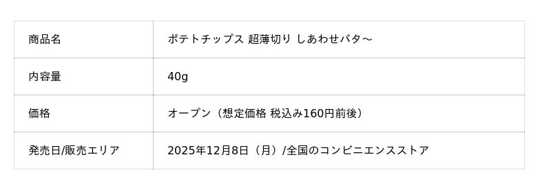 カルビー株式会社(本社:東京都千代田区、代表取締役社長兼CEO:江原 信)は、ジャガイモを極限まで薄くスライスし、シャクシャクッとした軽~い食感が特長の「ポテトチップス 超薄切り」シリーズから『ポテトチップス 超薄切り しあわせバタ~』を2025年12月8日(月)より全国のコンビニエンスストアで期間限定発売します(2026年1月中旬終売予定) 。