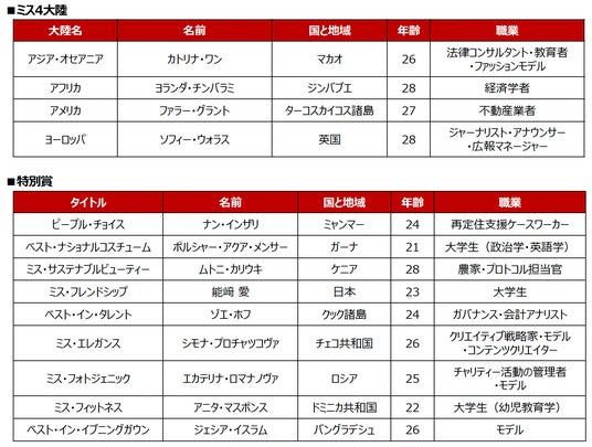 また、2位から5位までの入賞者に加え、ミス4大陸(アジアパシフィック/アフリカ/アメリカ/ヨーロッパ)、特別賞(ピープル・チョイス、ベスト・ナショナルコスチューム、ミス・フレンドシップ、ベスト・イン・タレント、ミス・エレガンス、ミス・フォトジェニック、ミス・フィットネス、ベスト・イン・イブニングガウン)、そして今年新設された「ミス・サスティナブルビューティー」の受賞者も選出されました。