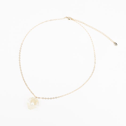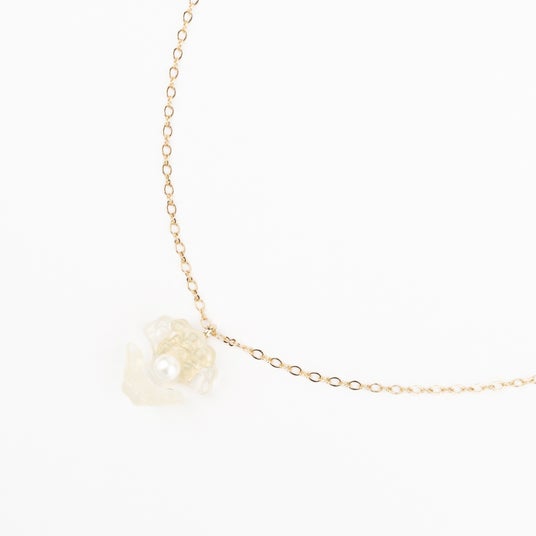 ネックレスは小粒ながら、シンプルなトップスに合わせれば、コーディネートに物語性と可愛らしさを添えてくれる、主役級の存在感をもつ一品です。