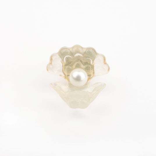 クリアな樹脂の中に極小ラメを閉じ込めることで、光を受けるたびに奥行きのある輝きを楽しめます。手書きのアートを思わせる柔らかく有機的なフォルムの中央にそっと佇むのは、パール。