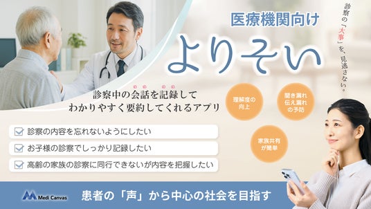 株式会社メディキャンバス(所在地:大阪府大阪市北区梅田1-2-2 大阪駅前第2ビル12-12、代表取締役:副田渓)が提供する、診察内容をわかりやすく手元に残せる医療コミュニケーション支援ツール「よりそい」は、これまで患者様を対象に延べ400名近くの方に使っていただいてまいりました。