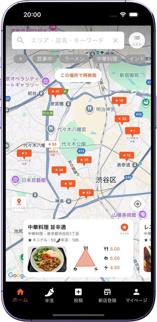 旨辛通ではユーザーが訪れたお店で感じた辛さ・旨み・痺れを投稿する「辛活」機能を搭載しています。