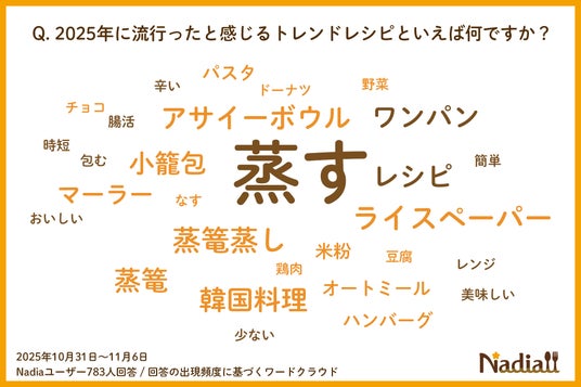 2025年は、物価高騰と時短ニーズを背景に、単なる手軽さだけでなく、健康志向や見映えの良さ、新しい食感といった付加価値を持つレシピが話題となりました。Nadiaではトレンドに関してユーザーアンケート(※1)を実施し、「2025年に流行ったと感じるトレンドレシピ」については、「せいろ」や「蒸す」を中心に、「麻辣湯」や「ライスペーパー」といった料理名や食材などもあがりました。