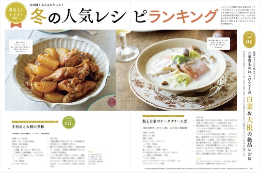 巻頭特集では、昨冬クックパッドの検索で注目を集めたキーワードのなかから、殿堂入りレシピ15品を含む、特に人気の高かったレシピを集めました。冬の人気野菜「白菜」「大根」