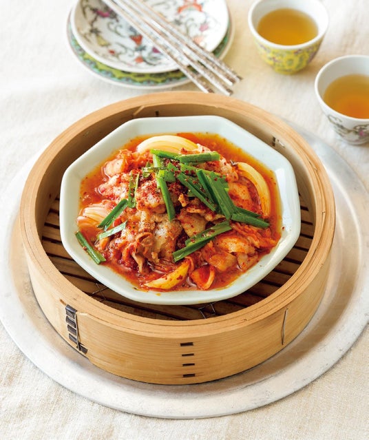 お皿ごと蒸しちゃえ【豚キムチの蒸籠蒸し】