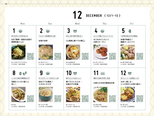 昨年の同じ日にクックパッドでアクセスが集中したレシピ3か月分をピックアップし、カレンダーにまとめました。その日の人気メニューがひと目でわかるので、おかずに迷ったときに便利です。