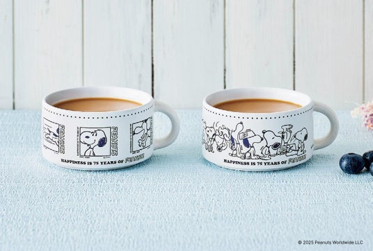 豪華2個セットのマグカップ。PEANUTSのコミック誕生75周年記念のアートより、1953年から 2000年までの各年代のスヌーピーがずらりと並んでいます。もうひとつには6つの年代のスヌーピーが!PEANUTSのこれまでの歴史を彩る歴代のスヌーピーが表情豊かにあしらわれており、どちらも眺めているだけでもほんわか癒やされます。