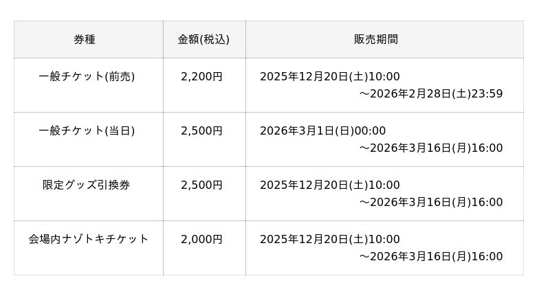 ・「限定グッズ引換券」および「会場内ナゾトキチケット」は、なくなり次第販売終了となります。
