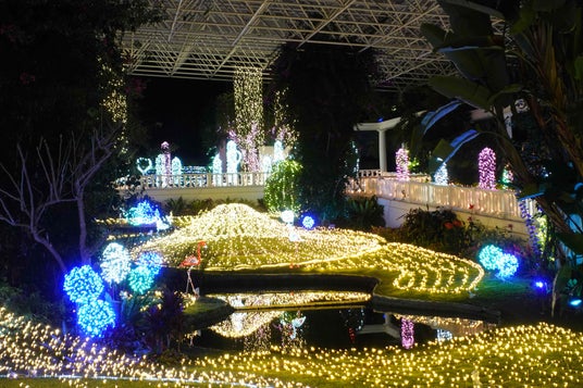 冬の名物「フラワーパークイルミネーション」では、約50万球の電飾が園内を幻想的に彩り、夜の植物園ならではの特別な景色が広がります。